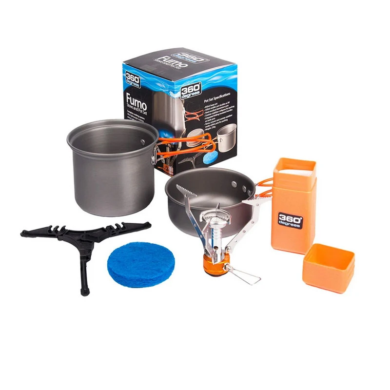 Der Furno Gaskocher und Topfset von 360° Degrees überzeugt durch seine 3.500 Watt Leistung. Trotzdem ist er sehr leicht. Gefertigt aus Edelstahl und Aluminium wiegt er ca. 100 g und bringt einen Liter Wasser unter optimalen Bedingungen in ca. 3:20 min. zum Kochen. Die Flamme lässt sich über einen einfachen Drehregler justieren. Der Kocher hat keinen Piezo-Zünder, was der Gewichtsersparnis zugute kommt. Ein großer und ein kleiner Top aus hart anodisiertem Aluminium beinhaltet das Furno Stove und Pot Set. Äußerst robust und dennoch relativ leicht, haben beide Töpfe stabile Klappgriffe mit einem Überzug aus Silikon.