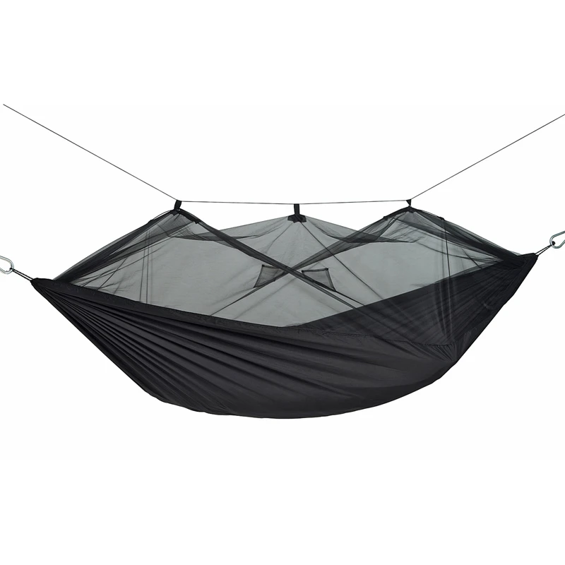 Diese Hängematte mit Moskitonetz ist dauerhaft gegen Insekten wie Moskitos, Stechmücken, Zecken, Ameisen etc. imprägniert. Die Imprägnierung an Stoff und Netz ist für Menschen unbedenklich, hautfreundlich, geruchsneutral, hitzebeständig und waschfest (bis zu max. 50 Waschgängen). Der Einstieg erfolgt seitlich durch einen Reißverschluss. Die Hängematte bietet einen großen insektenfreien Innenraum durch die patentierten, mitgelieferten Spreizstäbe. Mit geringem Packmaß ist die Hängematte beidseitig und natürlich auch ohne Netz nutzbar.
