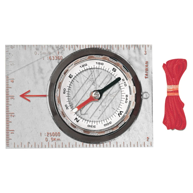 Coghlans Kartenkompass mit flüssigkeitsgedämpfter Nadel und durchsichtiger Bodenplatte, drehbarem Gehäuse und Anlegekante mit 1:25000 Skale, Lineal und Kordel zum Umhängen.