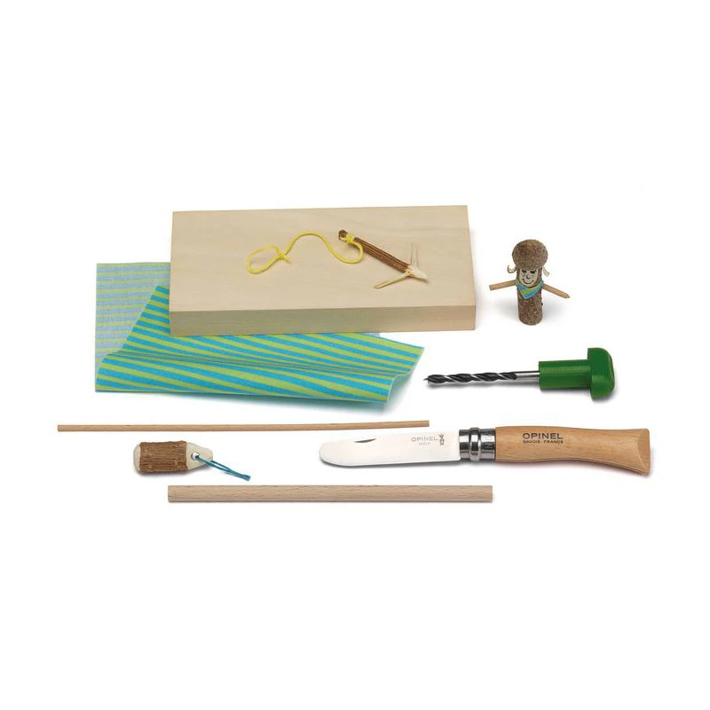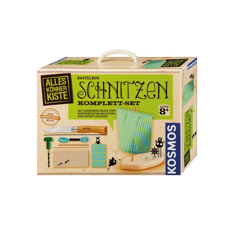 Inhalt: Opinel-Kinderschnitzmesser, Holzbohrer, Griff für Holzbohrer, Lindenholz-Block, runder Holzstab, Holzstäbchen, Stoffzuschnitt, Bündel Stickgarn, Sticknadel, Anleitung (32 S.)