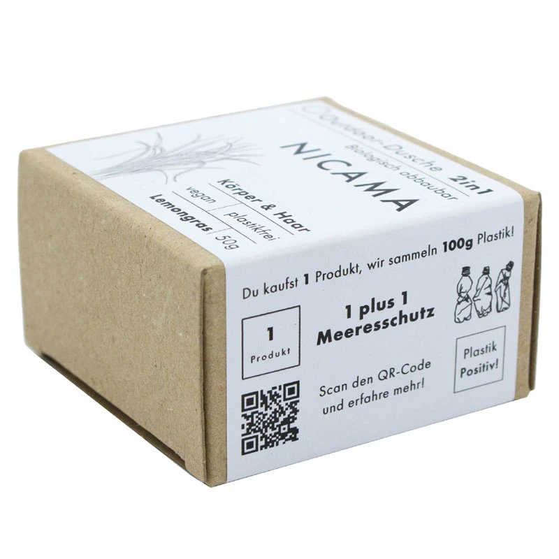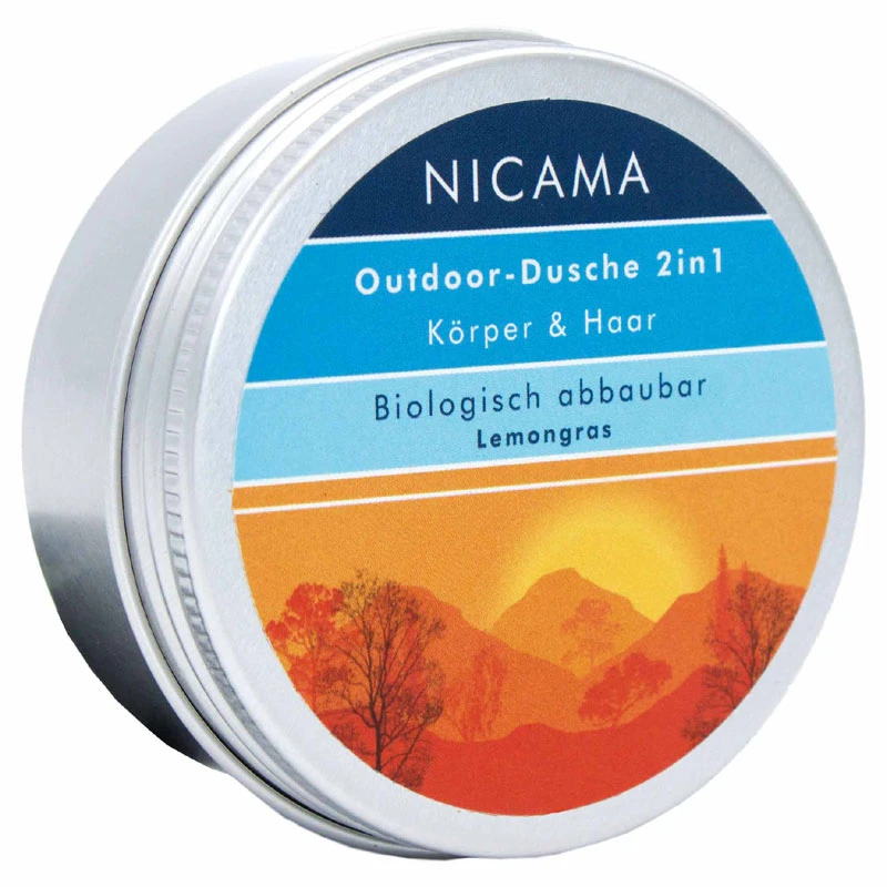 Die feste Outdoordusche 2in1 von NICAMA für Körper und Haar ist eine biologisch abbaubare Outdoorseife. Das feste Duschbad verzichtet auf jegliche Silikone, Parabene und andere bedenklichen Inhaltsstoffe.