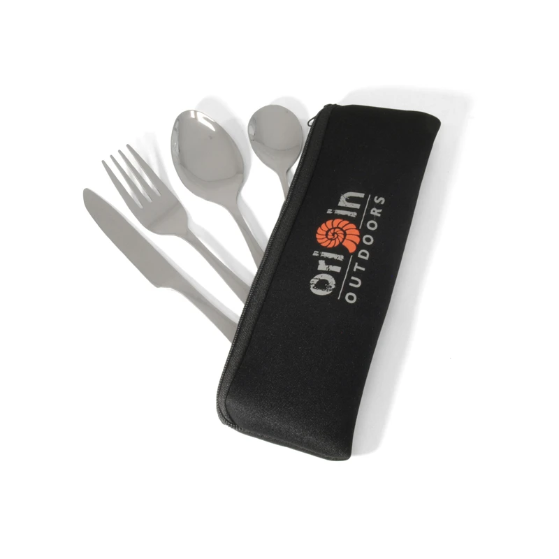Das sehr leichte Besteckset von Origin Outdoors besteht aus vier Teilen: Gabel, Messer, Ess- und Teelöffel. Diese lassen sich im leicht zu reinigenden Neoprenbeutel bequem transportieren. Das Besteck ist aus hochwertigen Edelstahl gefertigt und besitzt eine hohe Ergonomie.