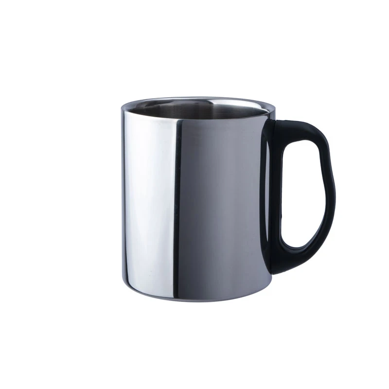 Polierter Thermobecher aus einer doppelwandigen Edelstahlkonstruktion hält Kaltes länger kalt und Heißes länger warm. Kunststoffgriff.