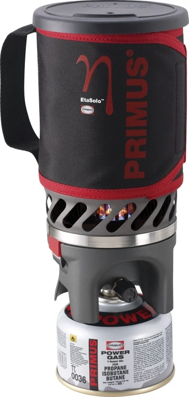 Der Primus Eta Solo – Das neue Kochsystem für Solotouren. Mit nur 365 g bietet dieses Set alles, was die Outdoorküche benötigt. Dank des Klickverschlusses und des Piezozünders ist der Kocher im Handumdrehen einsatzbereit und handlich zu bedienen. Der Kocher sorgt mit dem effizienten Brenner, dem Windschutz und dem Wärmetauscher für verbrauchsarmes Kochen. Mit einer 100 g Kartusche erreicht man so eine Stunde Kochzeit. Der Topf (0,9 L) ist mit einer nichtbrennbaren Neoprenummantelung versehen. Hält so das Essen warm und die Finger kühl. Ein integrierter Griff macht das Handling einfach und eine Öffnung im Deckel erlaubt das direkte Trinken aus dem Topf. Im Lieferumfang enthalten ist eine Aufhängevorrichtung (perfekt für Kletterer), ein dreifüßiger Ständer (für sicheren Stand), sowie ein Topfhalter (falls mal andere Töpfe auf dem Kocher benuzt werden sollen). Unterwegs packt man alles (inklusive 100 g Kartusche, nicht im Lieferumfang) platzsparend, sauber und kompakt in den Topf.