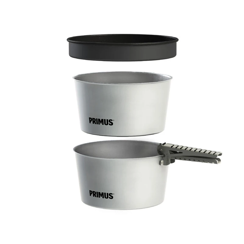 Das Essential Topf Set von Primus ist das optimale Starter-Set. Preiswert und leicht zu bedienendes Set mit zwei gleich großen Töpfen a 2,3 Liter und einer Pfanne, die praktischerweise einfach ineinander gestellt werden und so eine klapperfreie Einheit ergeben. Beide Töpfe sind aus Aluminium. Ein leichtes Material, welches die Hitze gut verteilt. Die Pfanne aus hart-eloxiertem Aluminium mit Antihaft-Beschichtung kann auch als Deckel für die Töpfe benutzt werden. Die Antihaft-Beschichtung sorgt dafür, dass nichts anbrennt. Das Topfset hat eine Alu-Topfzange.